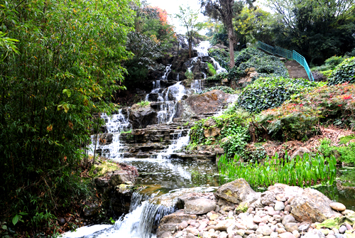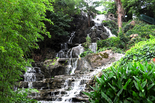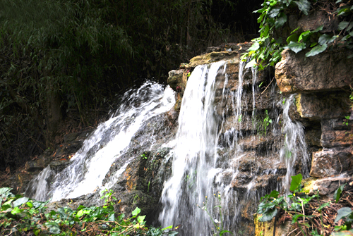 沿著潺潺溪水,拂開柳樹的萬條綠絲,踏著石砌小路拾級(jí)而上,聽到水聲漸響,千層疊瀑如巨幅的國(guó)畫展示在眼前。