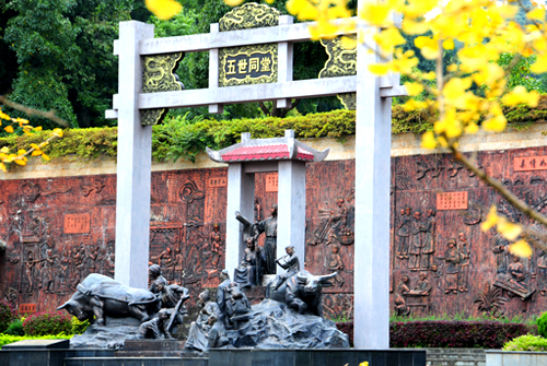 五世同堂親情廣場由主雕塑和背景浮雕兩部分組成,它以中國傳統(tǒng)文化為背景,展開了一個(gè)大家庭五世同堂的生動(dòng)畫面。
