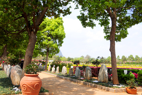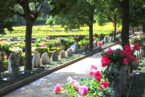 金寶山景觀葬屬融入于自然之景的新葬式,位于整個金寶山緩坡中軸線之央,教六區(qū)與天頤園相鄰之地,蔭香樟樹帶之下,單排于道兩側(cè),葬區(qū)兩端以雕飾魚缸收合,呈極好風(fēng)水之象。只見,一尊山石佇立于青草間,一塊碑刻置于山石前,山石后側(cè)配植以薔薇月季,花開四時,花石相映更顯靜謐。站于墓區(qū)端頭,綠蔭深遠,一派儼然之像。景觀葬契合現(xiàn)代殯葬改革理念,葬式自成一體小隱于自然,路人旁過景自成,親人旁立思更濃。