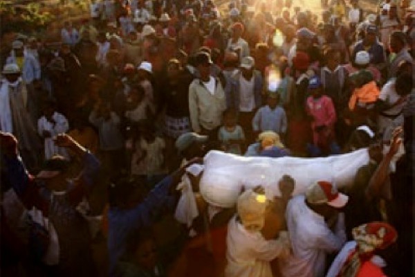 翻尸換衣儀式是馬達加斯加一個較新的傳統(tǒng)。在那里,人們?nèi)匀幌嘈潘篮箪`魂沒有完全離開身體,直至它腐爛,而這一過程可能需要數(shù)年。儀式的目的是用新的壽衣重新包裹尸體。這部分做完后,這個家庭就圍著換裝尸體的墓前跳舞,就好像這一天是她的生日。這一做法已在最近幾年比較少見,一部分原因是做壽衣的絲綢成本上升,另一部分原因是在于福音派基督教,他們對同已逝親屬的骸骨跳舞比較反感。