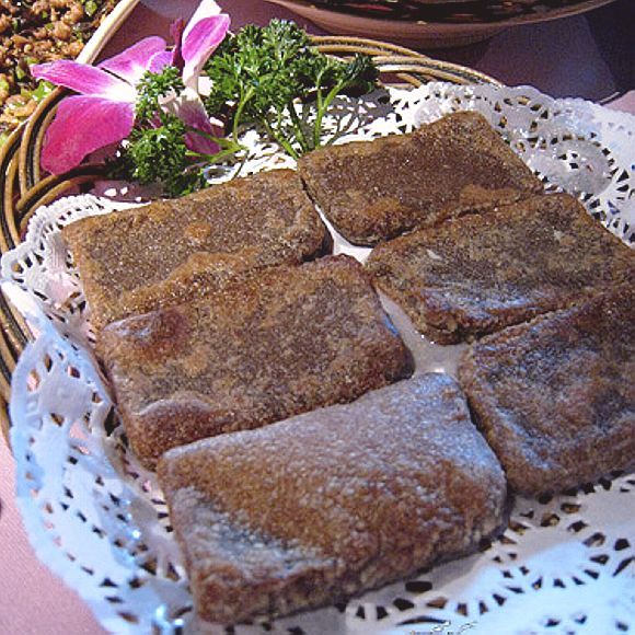 蒙自年糕的外型呈小碗狀,有紅糕白糕之分,紅糕呈棕紅色,白糕呈嫩黃色。蒙自年糕物美價(jià)廉,營養(yǎng)豐富。其食法簡便,需要食用時(shí),把它切成片,用油煎黃或用小火烘烤至軟,便可食用。一般用清油煎炸的年糕片,外酥內(nèi)糯,十分可口,是人們連年過節(jié)饋贈(zèng)親朋好友之佳品。蒙自年糕是古老的傳統(tǒng)食品,從前只是一家一戶生產(chǎn)。