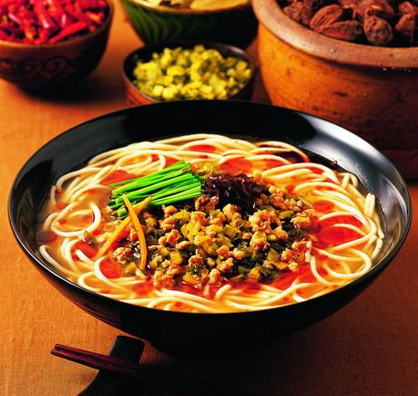 小鍋米線是一道“工夫菜”。。。在昆明任何一家普通米線館里你都可以看到這樣的場景: 大師傅把原料,調(diào)料都準(zhǔn)備好,分別用統(tǒng)一的碗盆盛了,整齊的排在一邊案上.新鮮米線是用碗一碗碗備好盛了摞在案上的,中間案上就是一組六眼或八眼的專門做小鍋煮品的強(qiáng)火灶眼,另一邊是只熬著筒子骨湯的大鍋.這小鍋灶上可就精彩了——八只十八公分直徑的黃銅帶直把的小鍋,大小也就一吃面條的碗一般.每只鍋里的內(nèi)容各有千秋,卻全都是五彩繽紛熱氣騰騰.煮米線的師傅右手一柄湯勺,從右邊一個喧沸的大鍋里舀起一勺高湯倒進(jìn)小銅鍋里,同樣是那把湯勺,在左邊案上舀半勺肉末和一點豬油放進(jìn)滾湯里,隨意瀟灑的攪拌三兩下,左手嫻熟的依次放入姜末, 酸腌菜,然后抬起一碗米線,右手順勢用湯勺擋一下,米線嘩啦就下了鍋,再順手一勺醬油.右手的大湯勺在盛放胡椒味精的盆盆里如蜻蜓點水輕快的一沾,抄進(jìn)小銅鍋.等鍋開了把韭菜,豆芽,豌豆尖兒抓進(jìn)鍋,再放一勺辣椒油.最后,取一塊白抹布擱在左手上,一把握住小銅鍋的木柄,對著右邊案上的空碗,"嘩",一碗紅的白的綠的褐的粉的熱氣騰騰香味撲鼻的小鍋米線就出鍋了.再順勢抓一撮鮮綠的芫茜蔥花撒在面上,猶如畫龍點睛之筆,頓時一碗湯熱,味鮮,爽口的小鍋米線就活了.整個過程如行云流水,一氣呵成.,微微的,恰到好處的一點酸味,鮮味,甜味和辣味,深得中庸之道......