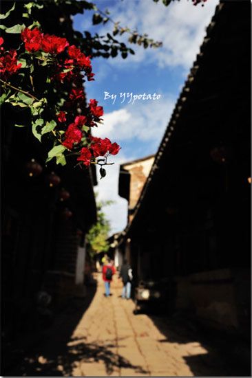整個古鎮(zhèn)依山而建,面臨龍川江,進(jìn)入的過道兩旁是仿古的建筑,門前都是一個臺子,是當(dāng)年做鹽業(yè)買賣的地方。門上“十星文明戶”的牌子,是“精神文明”的象征,嘿嘿!