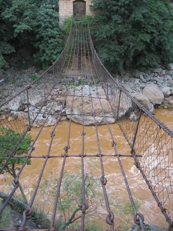 “鐵索橋”,又名 “普渡河橋”,位于祿勸縣翠華鄉(xiāng)頭哨與沿河辦事處之間的普渡河上。兩岸懸崖筆立,河水奔騰咆哮,地勢十分險要。該橋始建于1928年初。橋身由8根鐵索并列,再鋪上木板構(gòu)成,長36米,寬2米,西端又再接長10米的木結(jié)構(gòu)引橋,全長46米,是由尋甸通往金沙江邊的重要通道。
